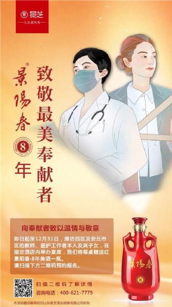 即日起至12月31日,濰坊四區(qū)及安丘市區(qū)的教師、醫(yī)護(hù)工作者本人及其子女,在指定酒店內(nèi)舉行婚宴、升學(xué)宴、寶寶宴等宴席,憑相應(yīng)證件(資格證件、身份證、結(jié)婚證、錄取通知書、出生證明等)進(jìn)行報(bào)名,每桌即免費(fèi)贈(zèng)送紅景陽(yáng)春·8年美酒1瓶!