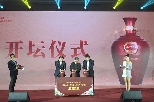 ▲魯菜理論專家、山東省旅游學(xué)院原教授趙建民,中國(guó)白酒工藝大師、景芝酒業(yè)總經(jīng)理來(lái)安貴,中國(guó)白酒大師、景芝酒業(yè)常務(wù)副總經(jīng)理趙德義為美酒啟壇